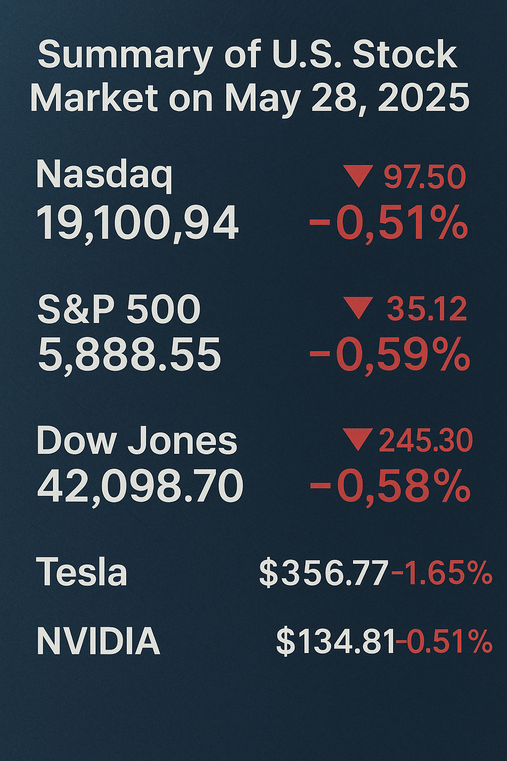 2025년 5월 28일 미국 증시는 나스닥과 S&P 500, 다우지수 모두 하락 마감했습니다. 엔비디아와 테슬라의 조정이 시장의 하방 압력을 키웠으며, 투자자들은 연준의 금리 방향성과 실적 발표 시즌 이후의 종목별 주가 움직임에 더욱 주목해야 합니다.